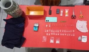Selain itu, turut diamankan sejumlah barang bukti lain seperti timbangan digital, plastik klip, hingga alat yang diduga digunakan untuk mengemas narkotika.