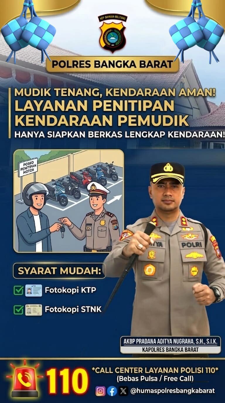 Dalam rangka mendukung pengamanan mudik Lebaran melalui Operasi Ketupat Menumbing 2026, Polres Bangka Barat menyediakan layanan penitipan kendaraan gratis bagi masyarakat yang akan meninggalkan rumah untuk mudik.