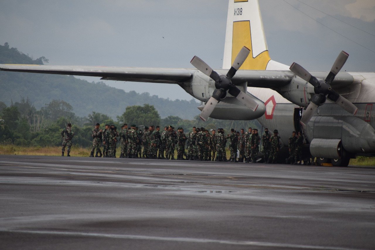 (Foto: Pasukan Yonif 501 Kostrad menggunakan pesawat C-130 Hercules tiba di Bandara Depati Amir, Bangka Belitung, Selasa (18/11/2025). IST/ Puspen TNI)