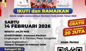 FORKODABABEL.COM, BANGKA — Dalam rangka meriahkan Festival Harmoni Ceria Imlek Kabupaten Bangka 2026, Dinas Pariwisata dan Kebudayaan Kabupaten Bangka akan menggelar Kejuaraan Imlek Run 5K Pelajar 2026 pada Sabtu, 14 Februari 2026 di kawasan Jalan S Parman Sungailiat.