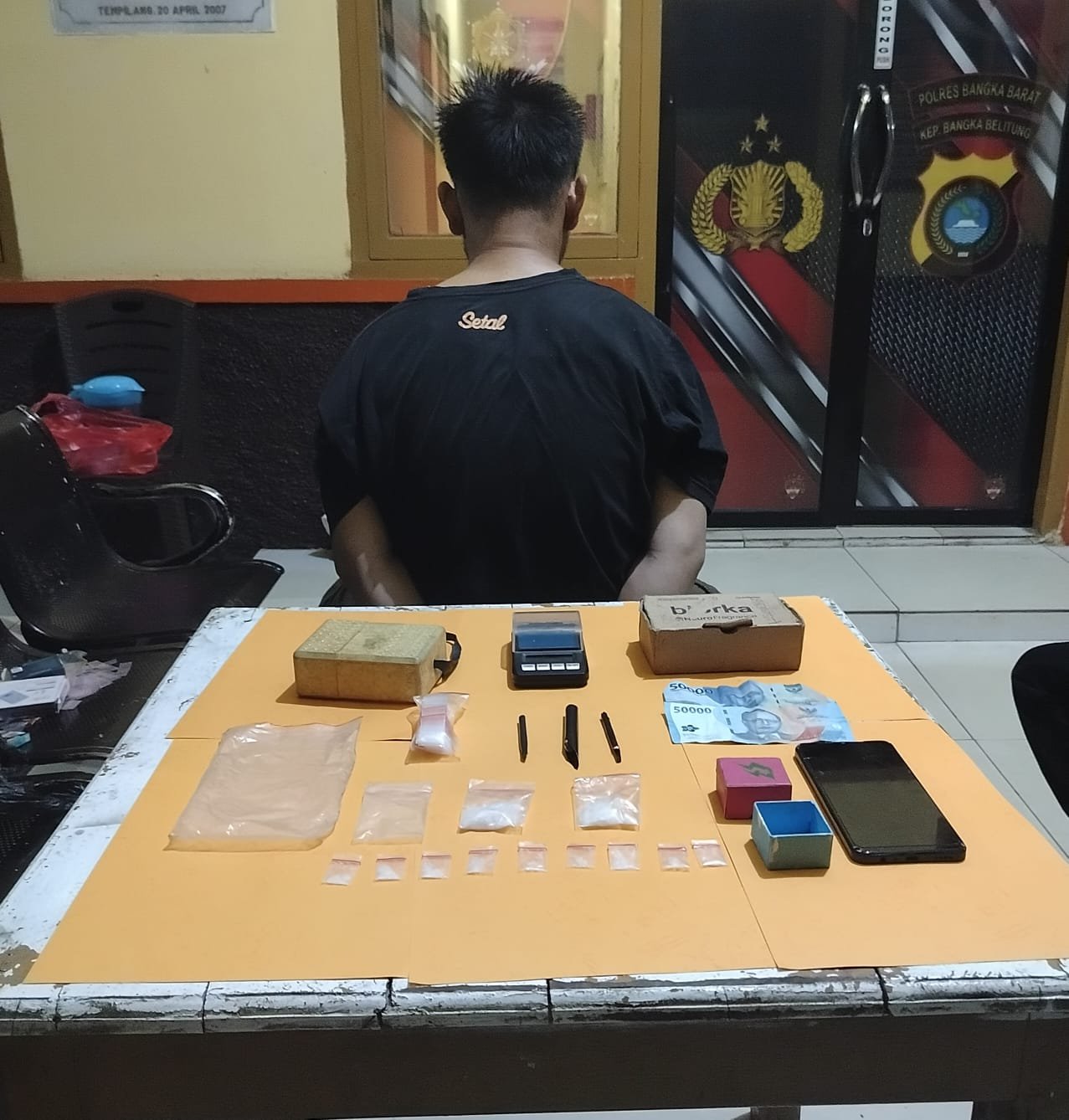 Tim kemudian melakukan penggeledahan lanjutan di rumah pelaku di Desa Tempilang dan berhasil menemukan dua paket plastik klip berisi kristal putih ukuran besar yang diduga sabu, satu bal plastik klip kosong ukuran kecil, serta perlengkapan lain yang digunakan untuk mengedarkan narkoba.