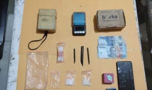 Adapun barang bukti yang diamankan berupa dua paket sabu ukuran besar, sembilan paket sabu ukuran kecil, satu bal plastik klip kosong ukuran kecil, tiga buah sekop plastik terbuat dari sedotan, satu unit timbangan digital warna hitam, satu unit handphone Realme warna hitam, beberapa kotak penyimpanan, serta uang tunai sebesar Rp100.000.
