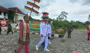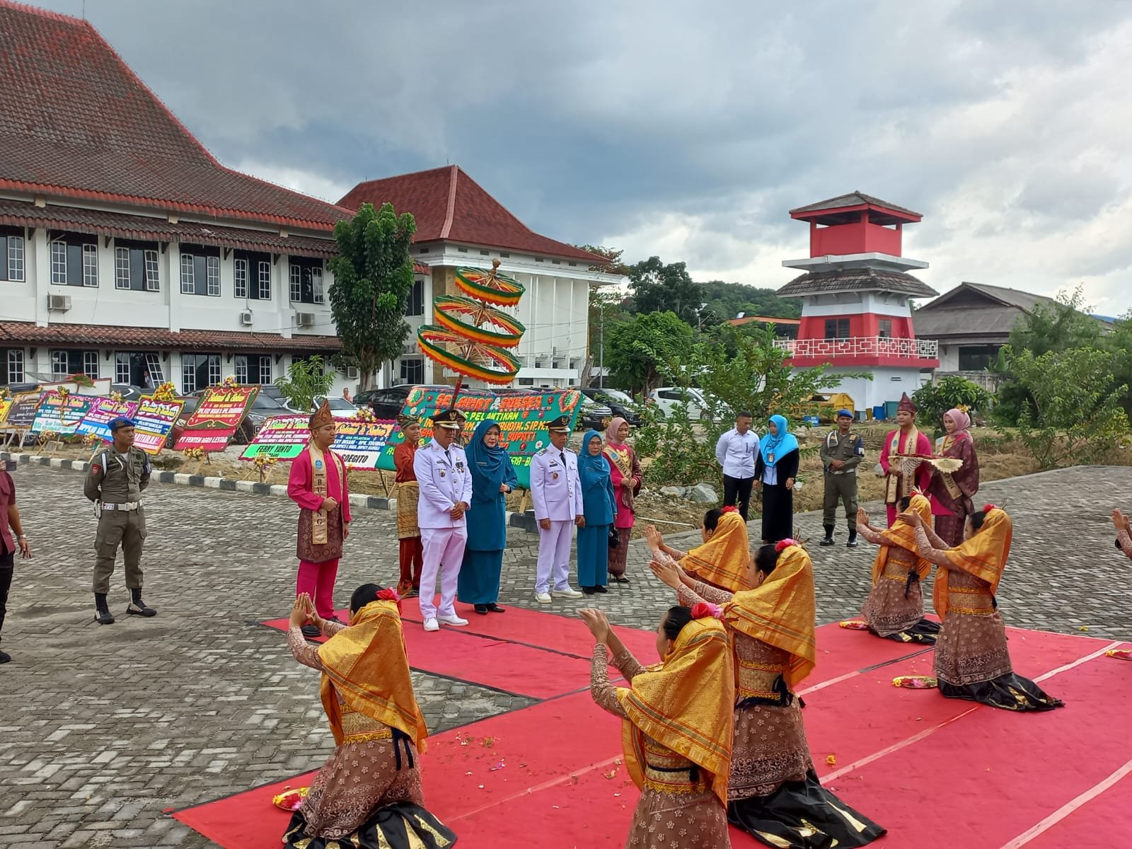 (Foto : Bupati dan Wakil Bupati Bangka H Fery Insani-Syahbudin disambut secara tarian adat sebelum kegiatan serah terima jabatan dan pisah sambut. Edw)
