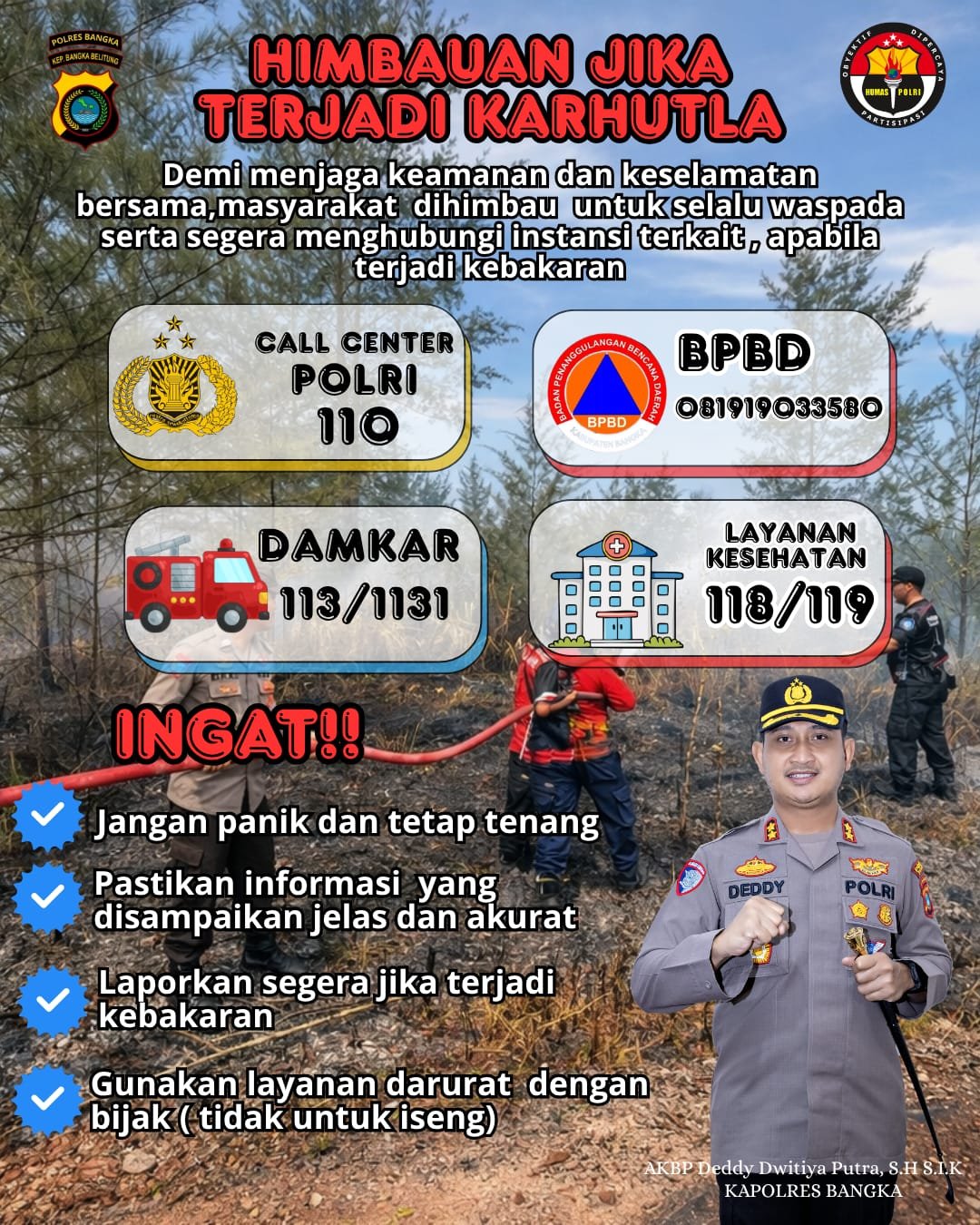 FORKODABABEL.COM, BANGKA — Dalam upaya meningkatkan kewaspadaan terhadap kebakaran hutan dan lahan (karhutla), Polres Bangka mengeluarkan imbauan kepada seluruh masyarakat agar tetap tenang dan sigap apabila terjadi kebakaran di wilayahnya, Rabu (01/04/2026).