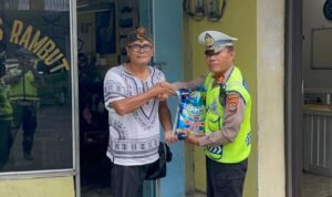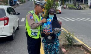 Dalam kegiatan itu, personel Satlantas membagikan bantuan berupa paket sembako kepada warga yang membutuhkan.
