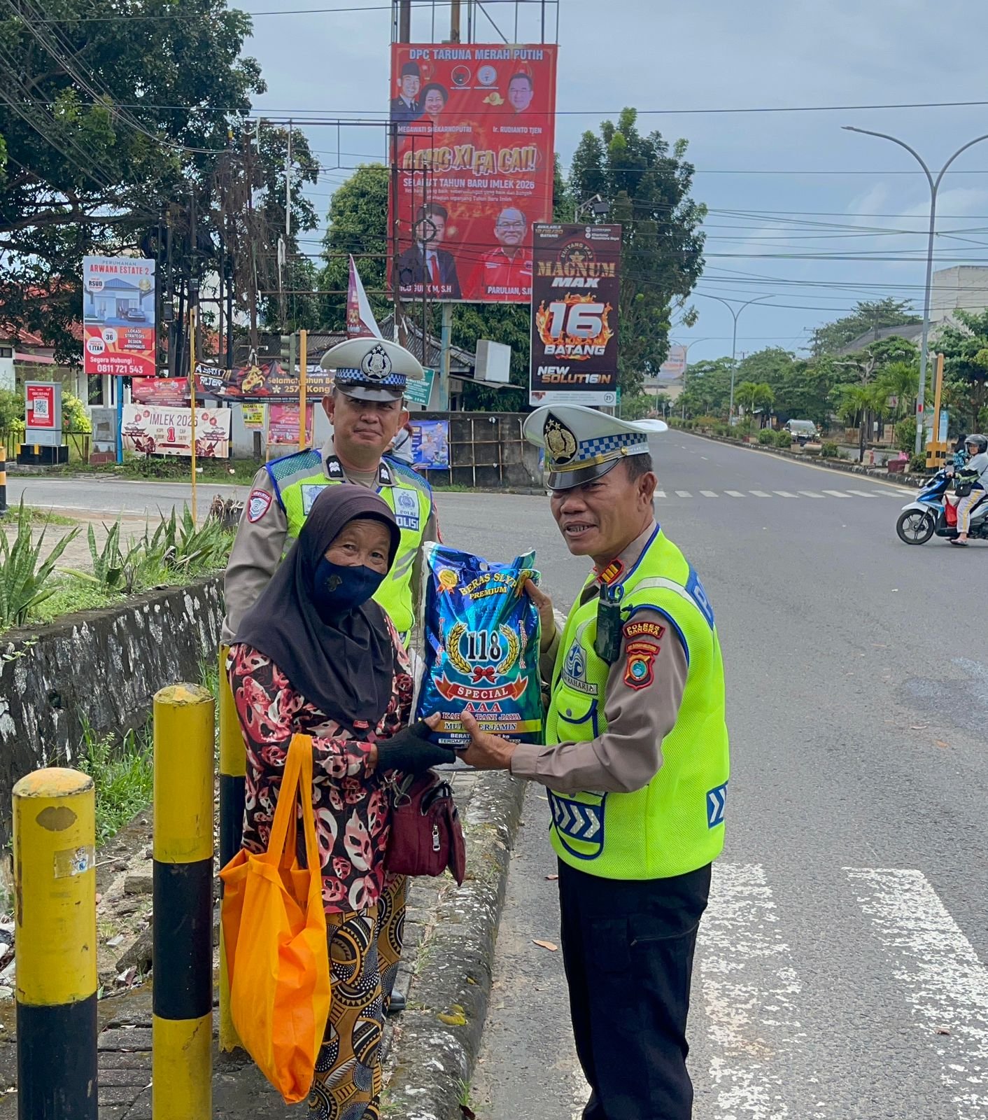 Dalam kegiatan itu, personel Satlantas membagikan bantuan berupa paket sembako kepada warga yang membutuhkan.