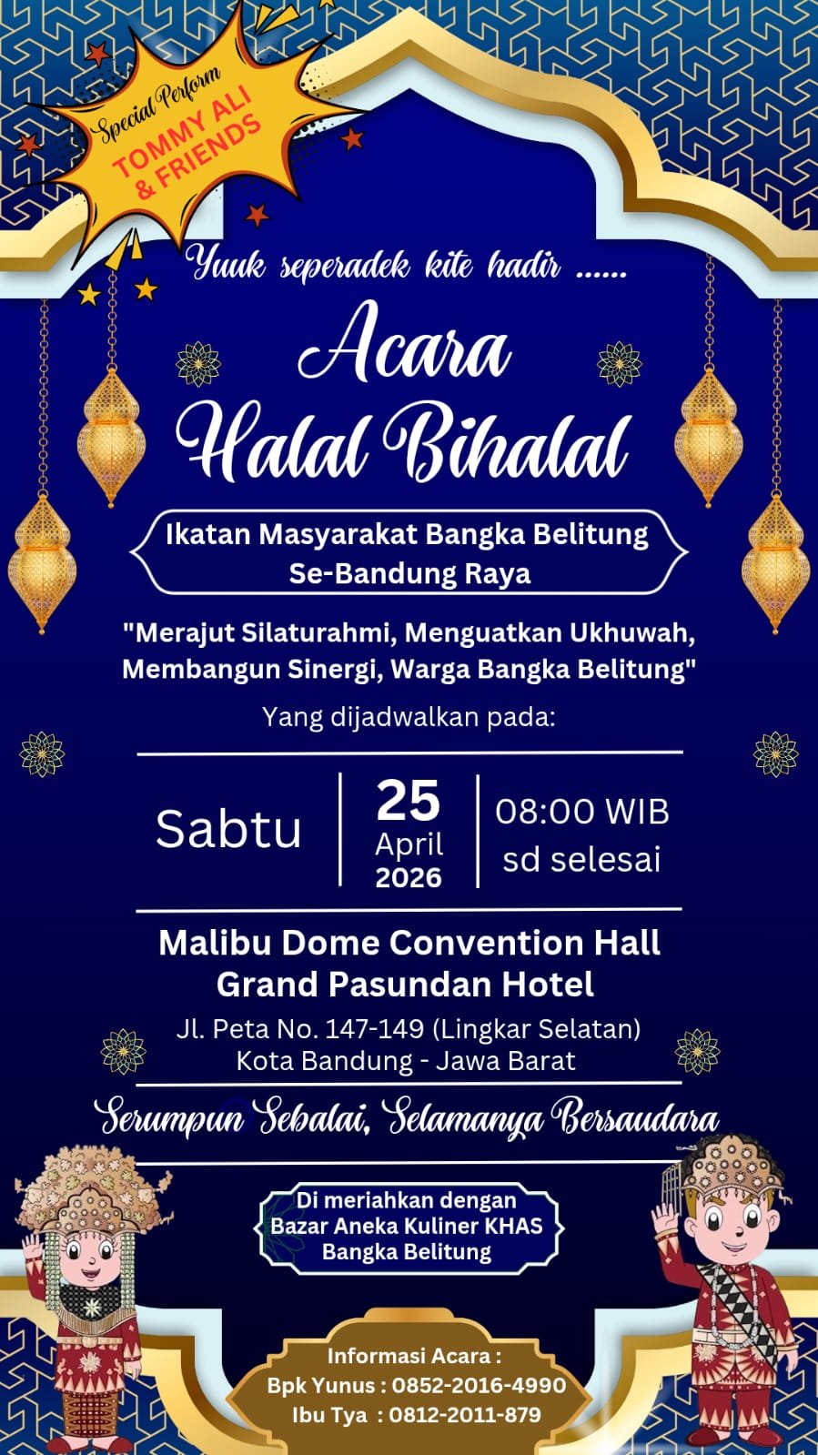 FORKODABABEL.COM, BANGKA –– Ikatan Masyarakat Bangka Belitung (IMBB) Se-Bandung Raya akan menggelar kegiatan Halal Bihalal (HBH) Masyarakat Bangka Belitung di Malibu Dome Convention Hall Hotel Grand Pasundan Kota Bandung pada Sabtu (25/04/2026).
